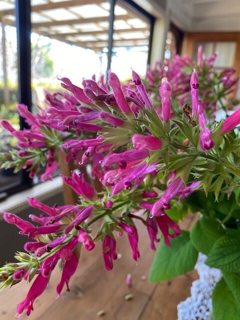 Salvia ‘Marwin Gardens’ : is a medium to tall bushy upright shrub 1.5-3mH, with lanceolate leaves and trusses of watermelon pink flowers in winter. A S.karwinski hybrid, found at Marwin Gardens in California. Although summer and winter hardy, tolerating a light frost, it is best grown in a sunny protected position.