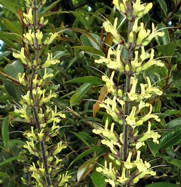 Flowers: are an open falcate type, pale to butter yellow in colour, with a straight hood and almost hairless. Most of the flowers are facing upwards with all the anthers and stigma in full access to bees and other insects.