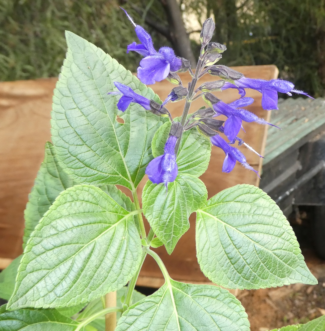 Salvia mexicana ‘Byron Flint’: A tall bushy Salvia with a compact flower head of purple tubular flowers and green and black mottles calyces. Flowering in Autumn. It is similar to S. mexicana ‘Bill Whitehead’, but taller with more green mottling in the calyces.