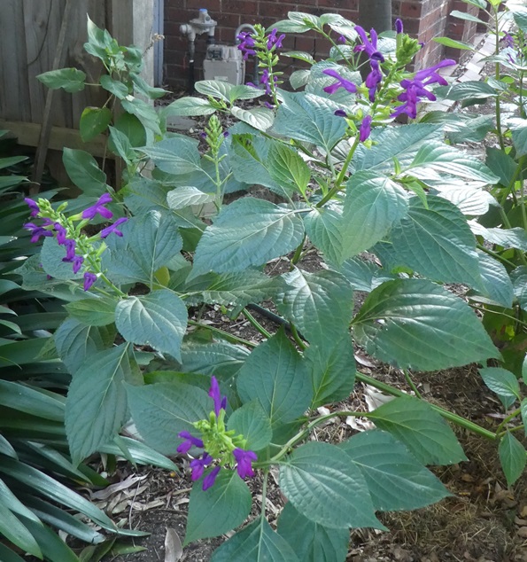 Salvia mexicana ‘Wildwood’: is a tall bushy Shrub 2-3mH with many spires of violet purple flowers in autumn. Best grown in dappled shade with protection from hash winds and frost.