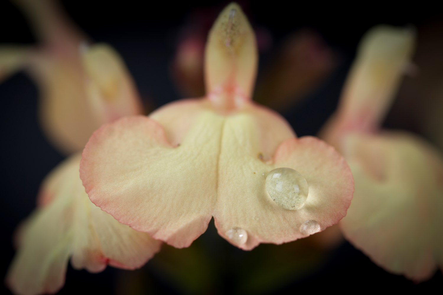 Flowers: are a beautiful warm pale orange typical microphylla type flower with the two side lobes and the edge of the skirt a darker orange, giving the flower a warm glow. The bottom lobes turn down with a lighter bee line coming from the throat.