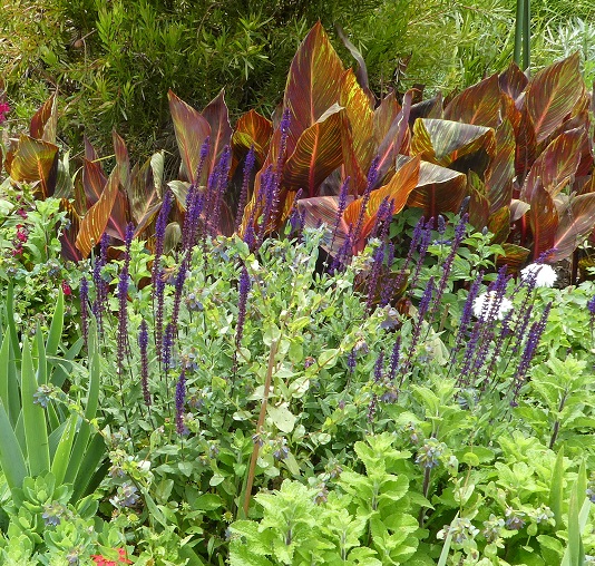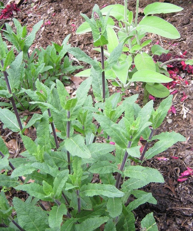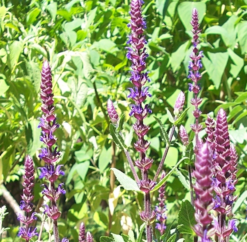 Salvia nemorosa Caradonna’ is one of the few plants in this grouping that have very dark stems, contrasting well with the pale leaves.
