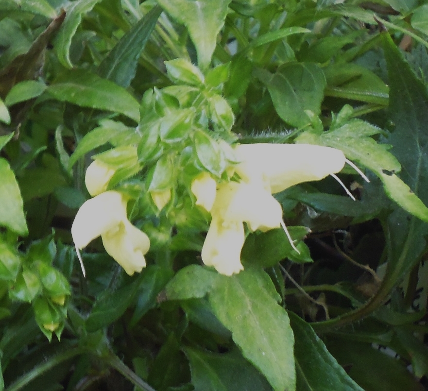 All lobes are the same pale yellow colour, the 2 side lobes are folded back to open up the throat area, making it easier for bees and other pollinating insects to enter. The middle lobe is longer, fairly straight, with a slight frill at the end to act as a landing place for insects. Although there are no markings around the throat area, the throat opening is wide with all the flower parts in full view to help in passing the pollen on to the back of the insect.