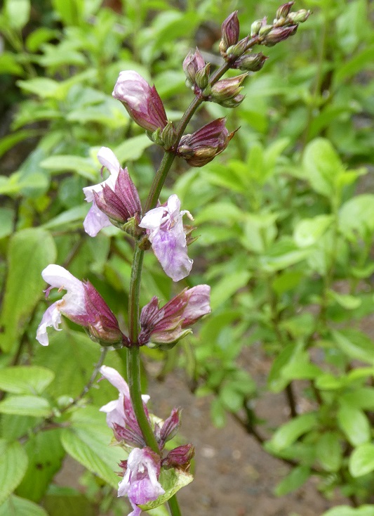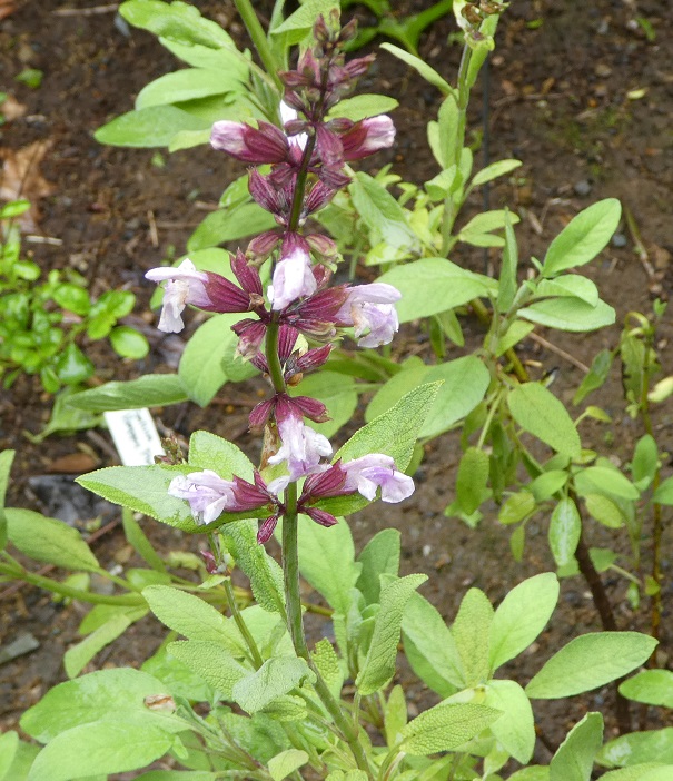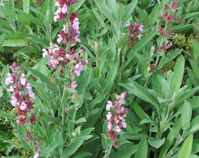 Salvia officinalis ‘Rosea’: is a low bushy subshrub, 30 – 40cmH with stems of pale pink flowers in spring, continuing through to late summer.