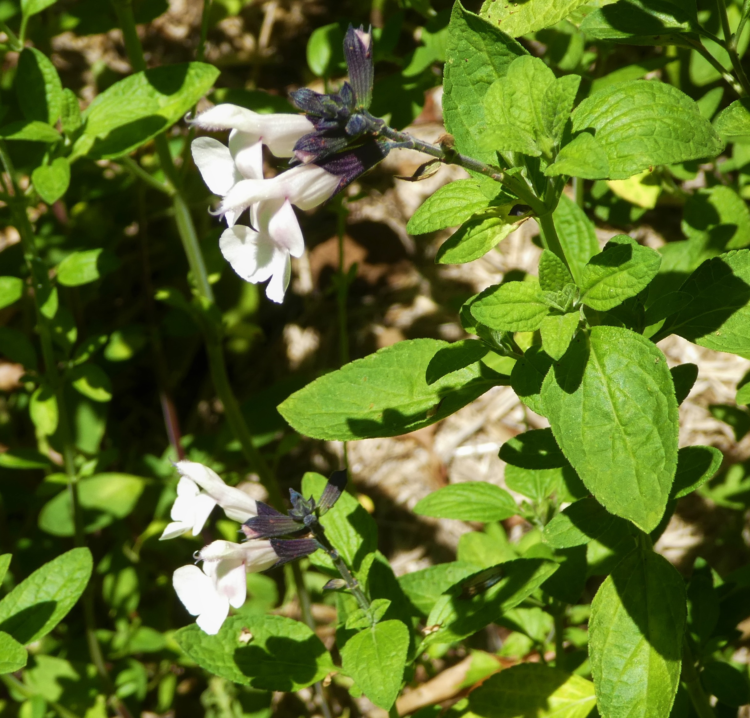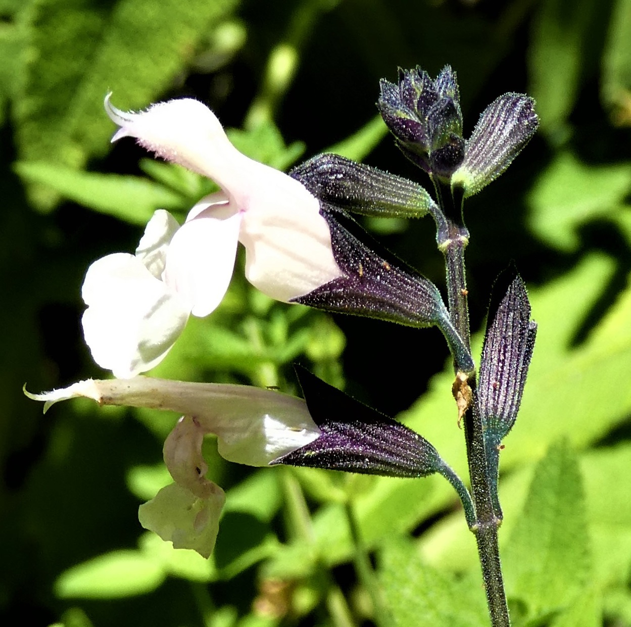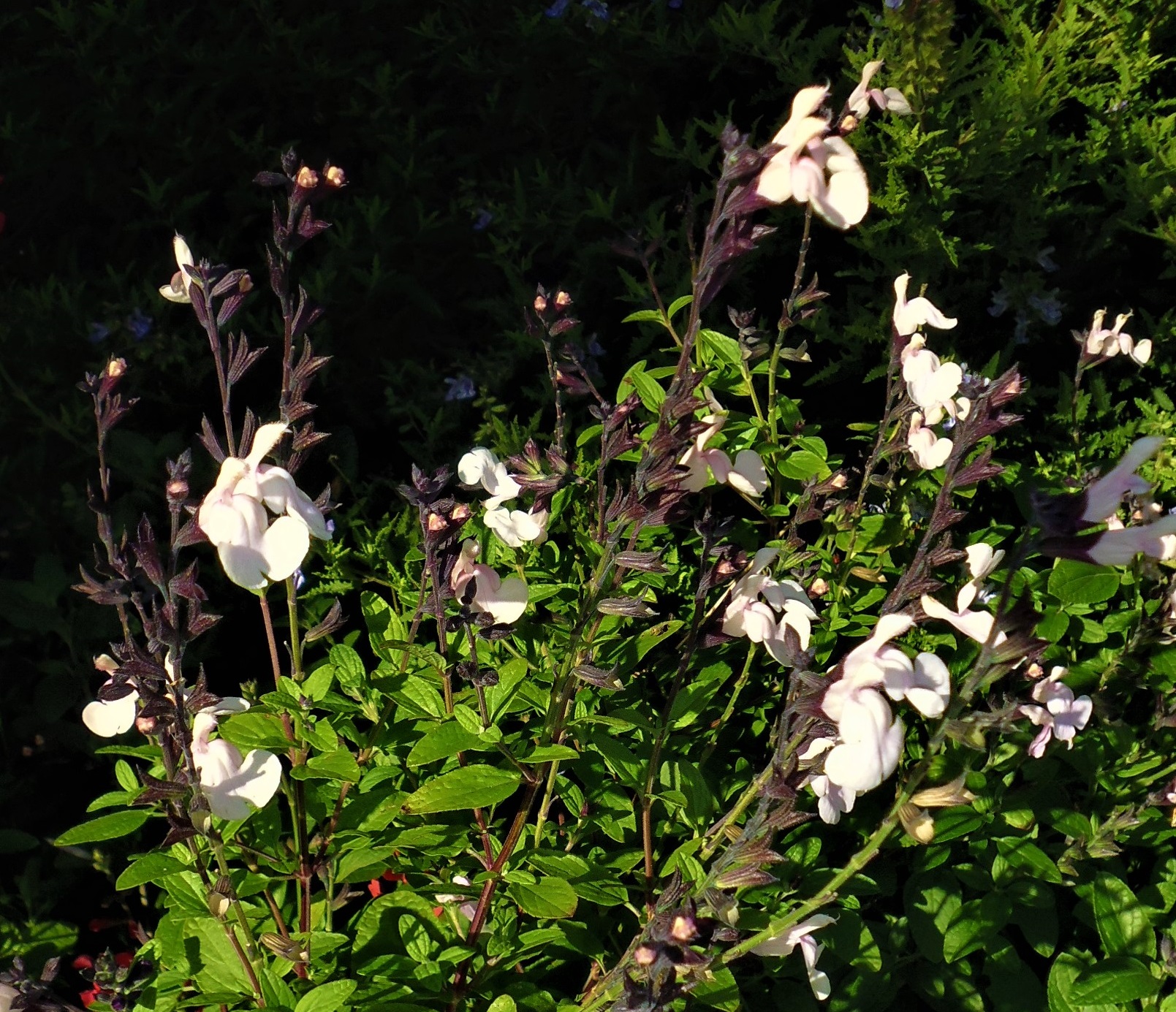 Salvia ‘Pink Champagne’: is a small microphylla type subshrub 60-80cm H with pale pink white flowers and very dark calyces most of the year.