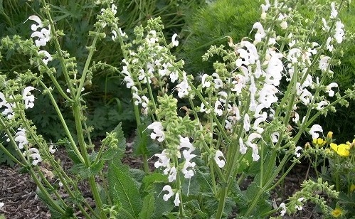Salvia pratensis ‘Swan Lake’: is a herbaceous perennial 60-80cmH with basal foliage and spires of white flowers in spring and summer.