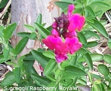 Salvia ‘Raspberry Royale’ (greggii): A small compact bushy subshrub 40cmH for a sunny position with lovely crimson flowers and dark pink calyces.