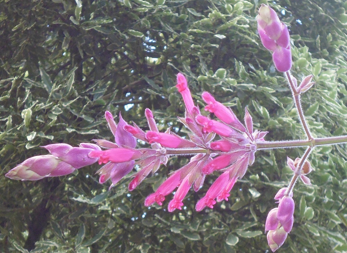 Salvia ‘Romantic Rose’ ( involucrata): is a tall shrub 3-4mH with arching branches and brushes of watermelon pink flowers in winter.