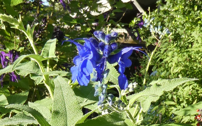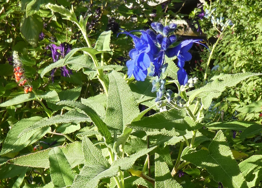 Salvia sagittata var cajamarca: is a tall, upright hardy shrub, 2mH with large hastate leaves and bright blue flowers in winter.