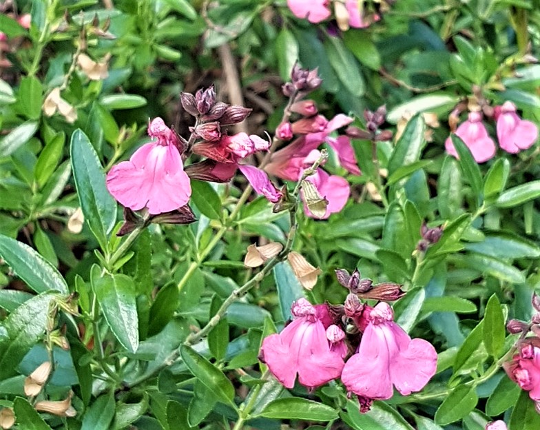 Salvia ‘ Sierra Pink’ (greggii): a small compact bushy subshrub 60cmH for a sunny position with bright pink flowers which flowers continually.
